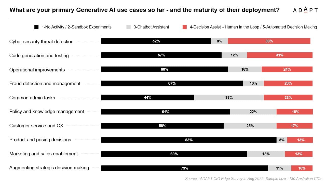 CIOs are accelerating AI ambitions, but maturity remains low. Generative AI adoption spans cyber security, code generation, customer service, and operations, yet most deployments are still in pilot or decision-support stages. Agentic AI is even earlier in its lifecycle, with 87% of organisations at awareness or exploration. Governance, trust, and human oversight dominate evaluation criteria, underscoring a cautious approach. Despite this, nearly half of CIOs aspire to enterprise-scale AI and automation as their defining initiative if budgets were no barrier.